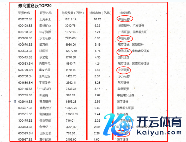 皆知说念牛市炒券商。 因为成交量成交额放大,券商佣金业务增长是不言而喻的。 然而,好多东说念主却忽略了证券公司的另一个业务增长点。 那便是他们的自营业务,说白了也便是用我方的钱投资炒股。 证券公司自身就领有专科的投研团队和丰富的投资教悔,再加上资金上风,在一轮牛市行情下来,他们的自营业务也会有相配可不雅的收益。 券商重仓的公司相对来说是具有投资价值的,然而也并不料味着这些公司就一定会有相配好的投资申诉,因为股票的涨跌还受到好多轮廓要素的影响。 今天笑笑整理了券商重仓的20家公司(附表在文末),
