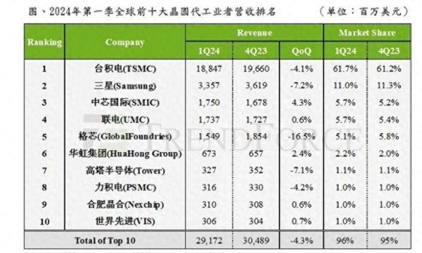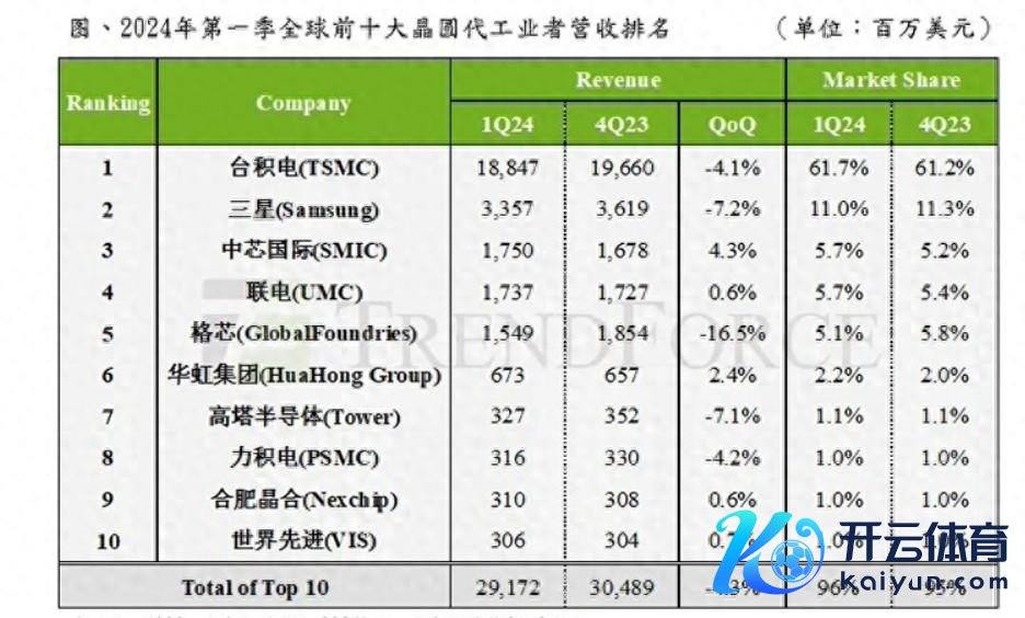 如下图所示,这是2024年Q1的数据,中芯海外全球第三、华虹集团全球第六、合肥晶合全球第九名。
