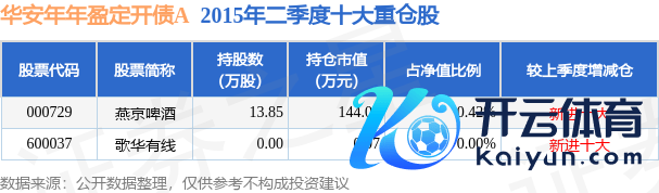 本站音讯,12月20日,华安年年盈定开债A最新单元净值为1.0462元,累计净值为1.3852元,较前一交游日上升0.3%。历史数据裸露该基金近1个月上升1.51%,近3个月上升0.68%万博manbext体育官网app官网,近6个月上升1.59%,近1年上升3.84%。该基金近6个月的累计收益率走势如下图: 华安年年盈定开债A为债券型-羼杂一级基金,证实最新一期基金季报裸露,该基金钞票确立:无股票类钞票,债券占净值比55.6%,现款占净值比3.55%。基金十大重仓股如下: 该基金的基金司理为