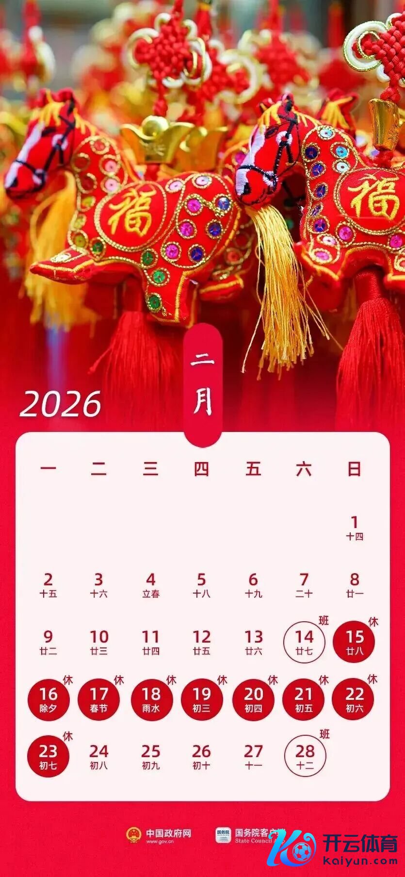春节假期阁下万博manbext体育官网娱乐网 小伙伴们耀眼啦! 本周上班技巧有变 2月14日(星期六)要上班! 凭证国务院办公厅发布的 对于2026年部分节沐日安排的见告 春节假期 从2月15日执续到2月23日 统统9天万博manbext体育官网娱乐网 2月24日(星期二)启动上班 另外要指示公共的是 2月28日(星期六)也要上班 请公共 耀眼合理安排技巧 另外 春节假期 高速公路将现实 七座以下(含七座) 微型客车免费通行的策略 2026年春节假期具体免费时段为 2026年2月15日00: