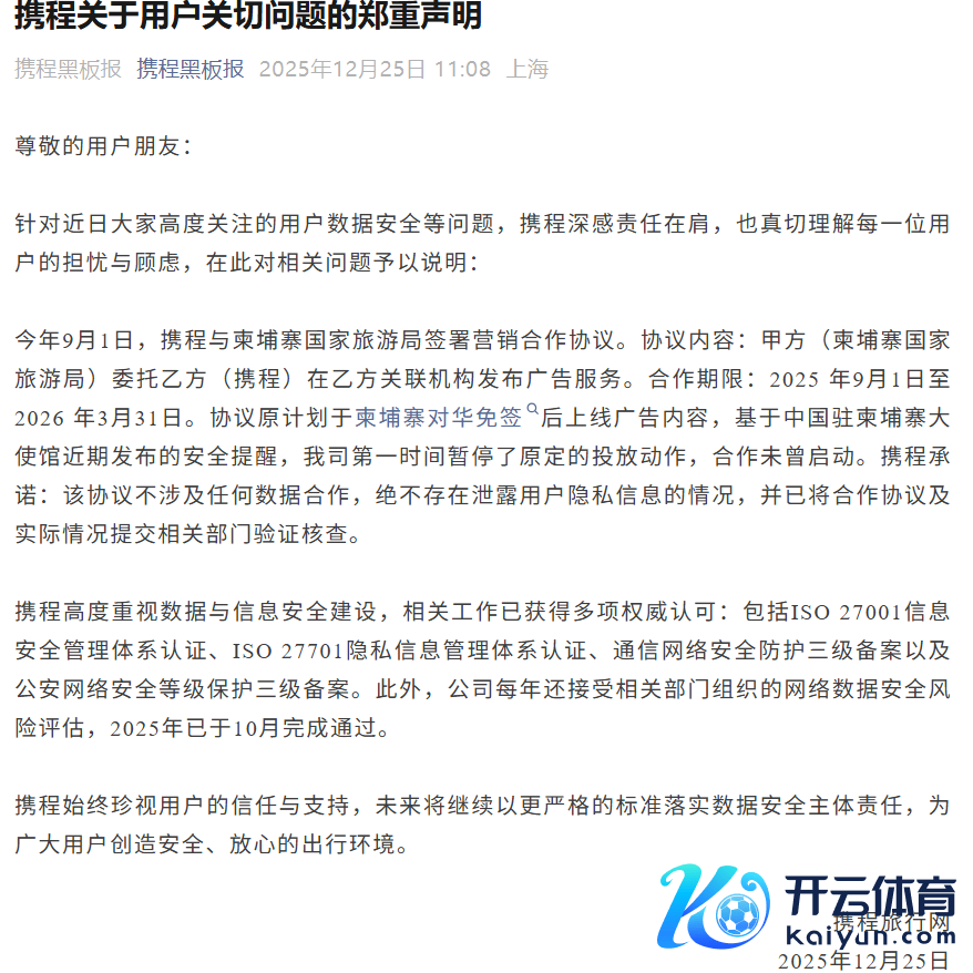 携程声明:与柬埔寨国度旅游局合营未尝脱手,不触及任何数据合营携程声明:与柬埔寨国度旅游局合营未尝脱手,不触及任何数据合营