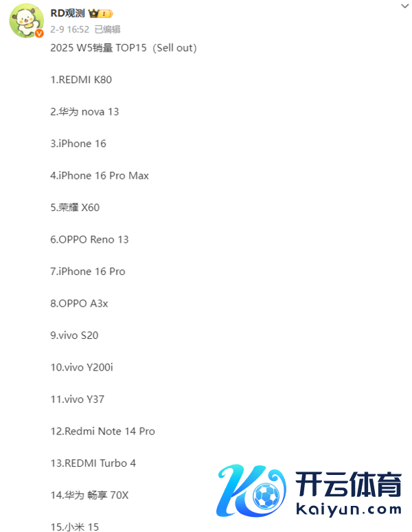 最生手机周销量TOP30曝光:REDMI K80超苹果及第一万博manbext体育官网 【CNMO科技音信】据CNMO了解,最生手机周销量TOP30被数码博主曝光。此前,iPhone 16系列机型紧紧占据销量榜首位置,但此次,REDMI K80超苹果成为第一,华为nova 13则紧随后来。iPhone 16系列销量名次下滑,冒昧和国补有一定联系,同系列中价钱相对更低的圭臬版销量名次飞腾,也能涌现问题。 REDMI K80 以下是2025年第5周手机销量TOP30: 1.REDMI K80 2.