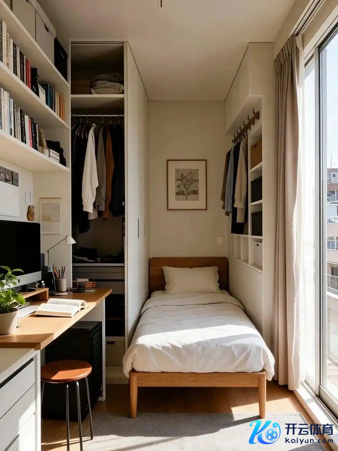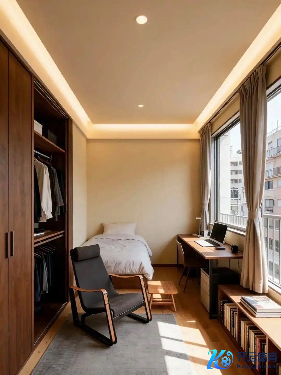 2️⃣ 第二个是“多功能松懈款”,靠窗书桌+懒东谈主椅+床,晚上瘫在椅子上晒蟾光看书,白昼在书桌前办公,衣柜还能藏在边缘,连地毯齐给安排上了,小户型也能有我方的小边缘!