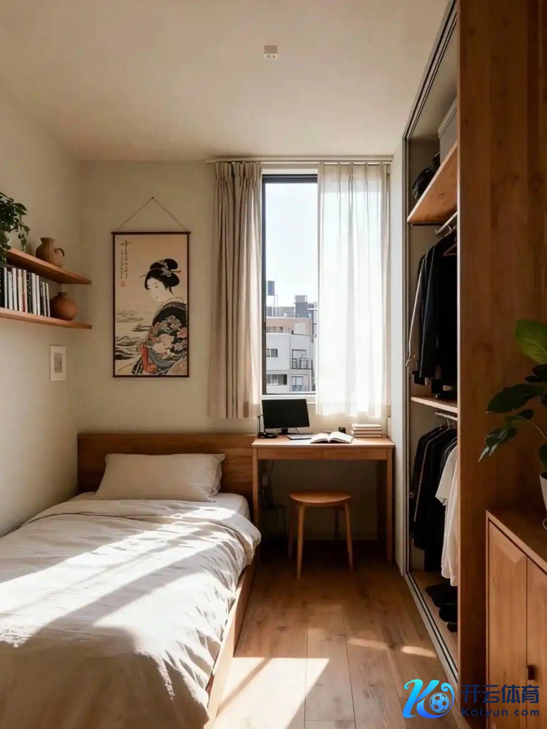 3️⃣ 第三个是“窗下书桌款”,床靠着墙,书桌径直怼在窗户下面,昂首等于当然光,学习办公齐超有力儿,墙上挂个浮世绘,日式那味儿一下就拿抓了!